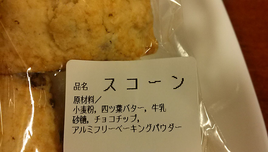 シンプルだからこそ、おいしい逸品。材料は小麦粉、四つ葉バター、牛乳、砂糖、チョコチップ、アルミフリーベーキングパウダー。さっぱりとして、ほんのり甘い味わい。こうした隠れた逸品が、さりげなく道の駅で売られているところが、いいですね。私は製品を選ぶとき、必ず原材料をチェックして、できるだけ添加物の含まれていない製品を買います。参考までに、コンビニなどで売っているスコーンの原材料。
